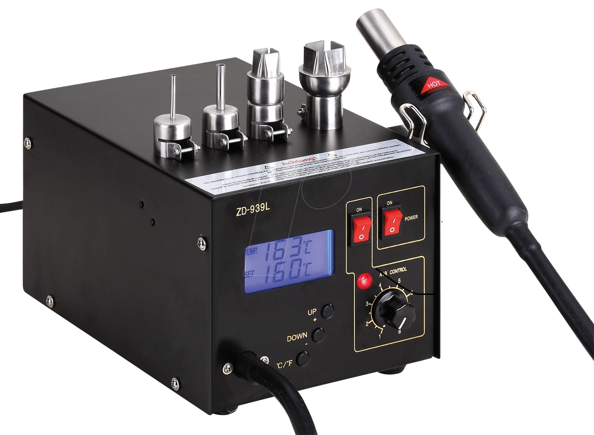 Description : Usage: 1.suitable for unsoldering multiple cmponents,such as SOIC,CHIP,QFP,PLCC andBGA,etc(especially for flat cables and cable connectors). 2.applicable for hot contraction,heating,depainting,degluing,defrosting.preheating and rubber soldering,and so forth. features 1.the products adopt closed loop of transducer.MCU intelligent drive.Digital LED display.High-power.the temperature turn up is very fast. Temperature stabilization and is impervious to air, Use the brushless fan,and long life and low noise, it is good for lead free work too 2.the air flow can be adjustable,and air blowing is big and gentle blowing plastic components won't be deformed. such as buzzer and external interface of mobile phone 3.it is inductance in the handle, it will be quickly to work when you take the handle; when the handle is return to the shelf,the machine will automatic stopage 4.automatic to blow cool air to safe the heating. temperature rapidly rises, and it can reach to the setting temperature only within 3 or 5 seconds. small volume light weigh, temp-control accurately 5. safely remove BGA-IC ,keep pins intact.Much more safe